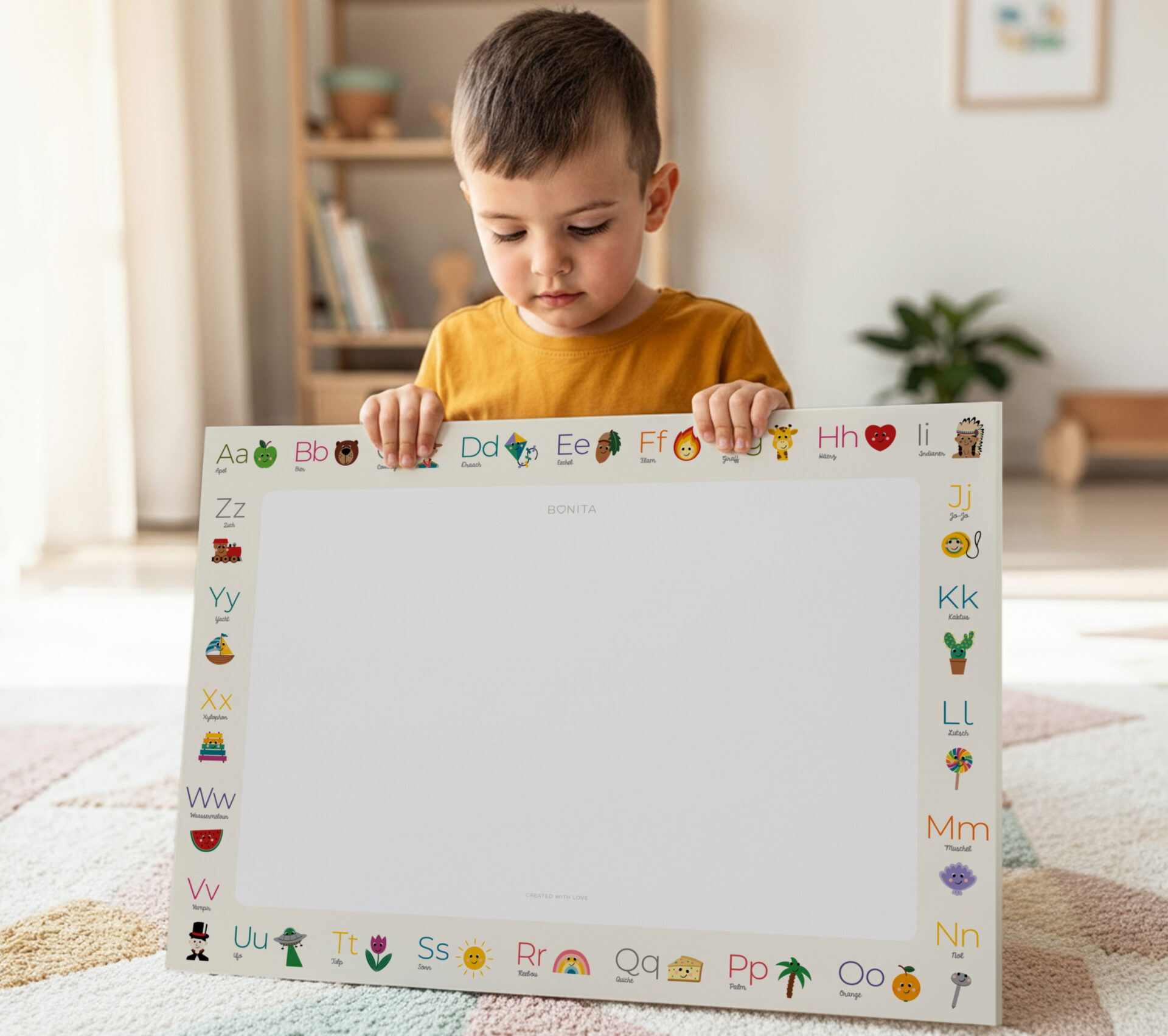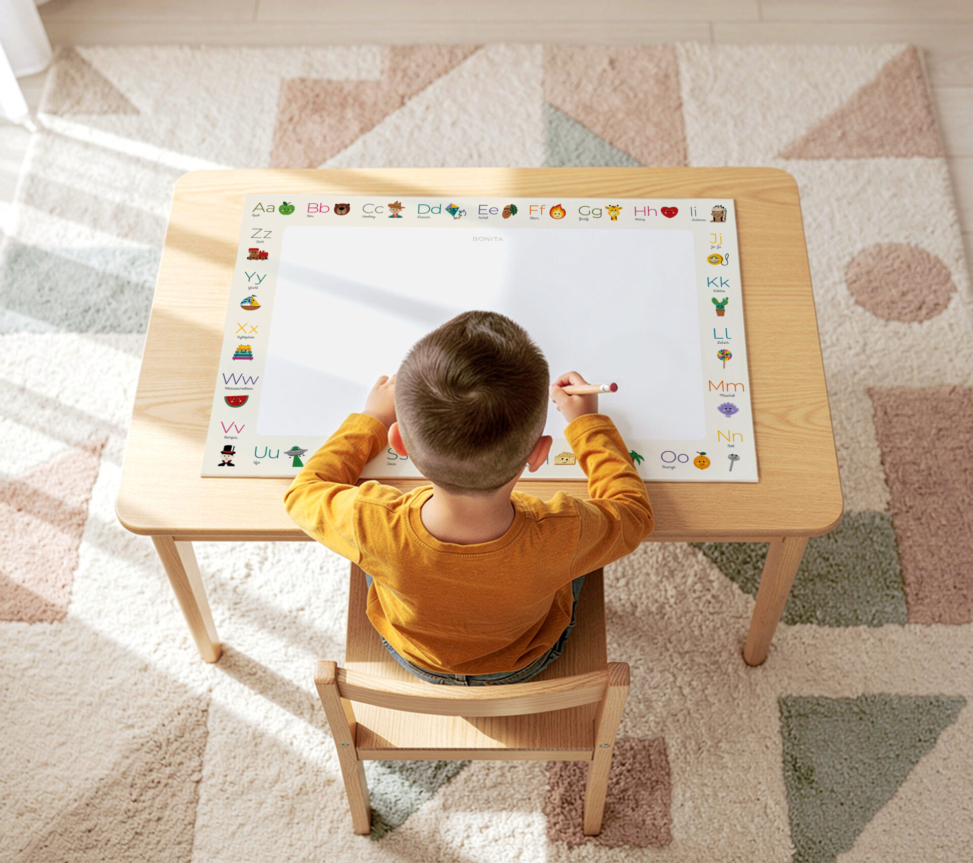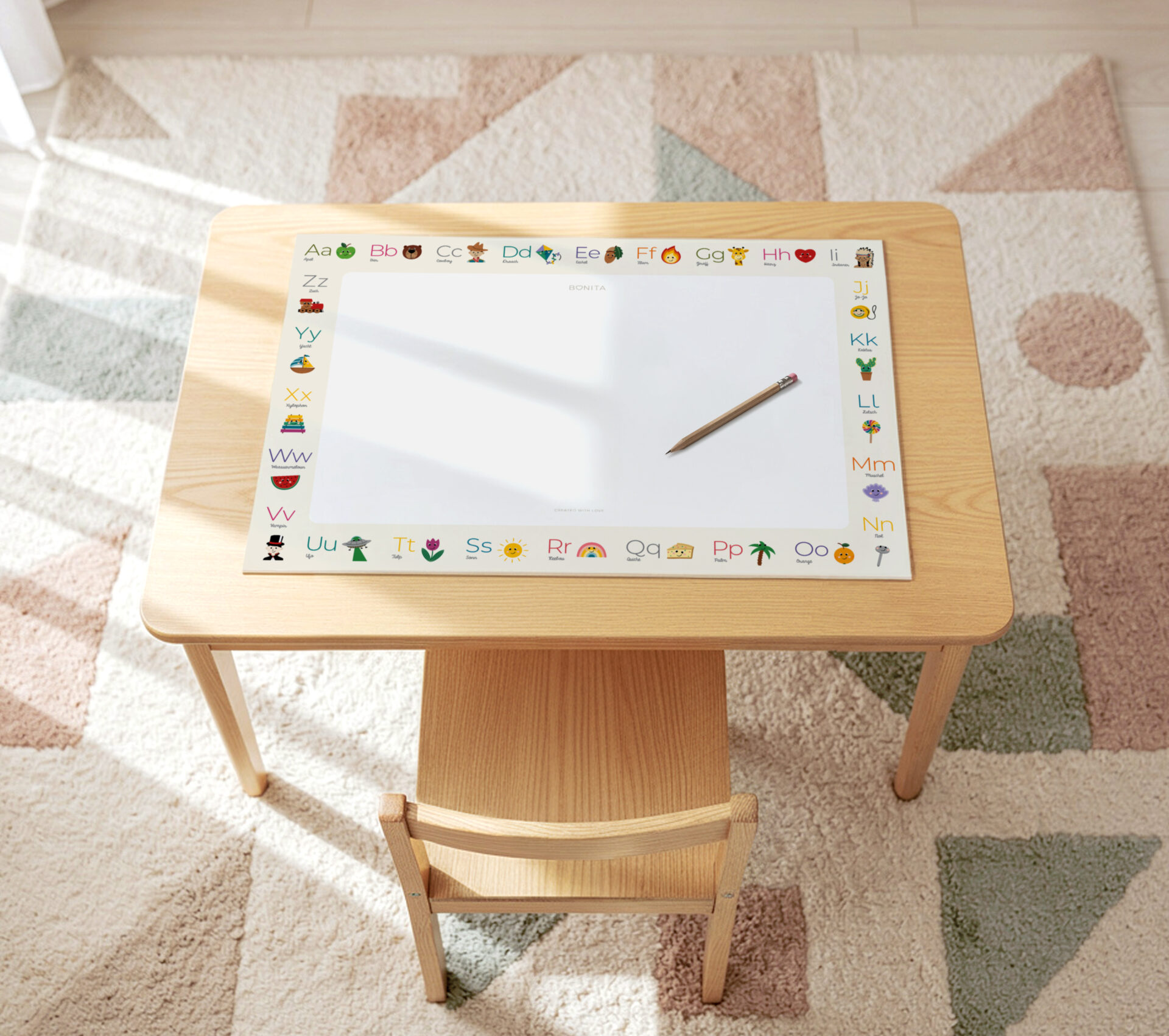 Plenty of space to explore the alphabet, right where learning happens every day. Designed for school starters to begin learning Luxembourgish with simple words and friendly illustrations, it supports letter recognition and early reading in a relaxed, confidence-building way. The mat is perfect for homework time, drawing breaks, and everyday learning at the table.